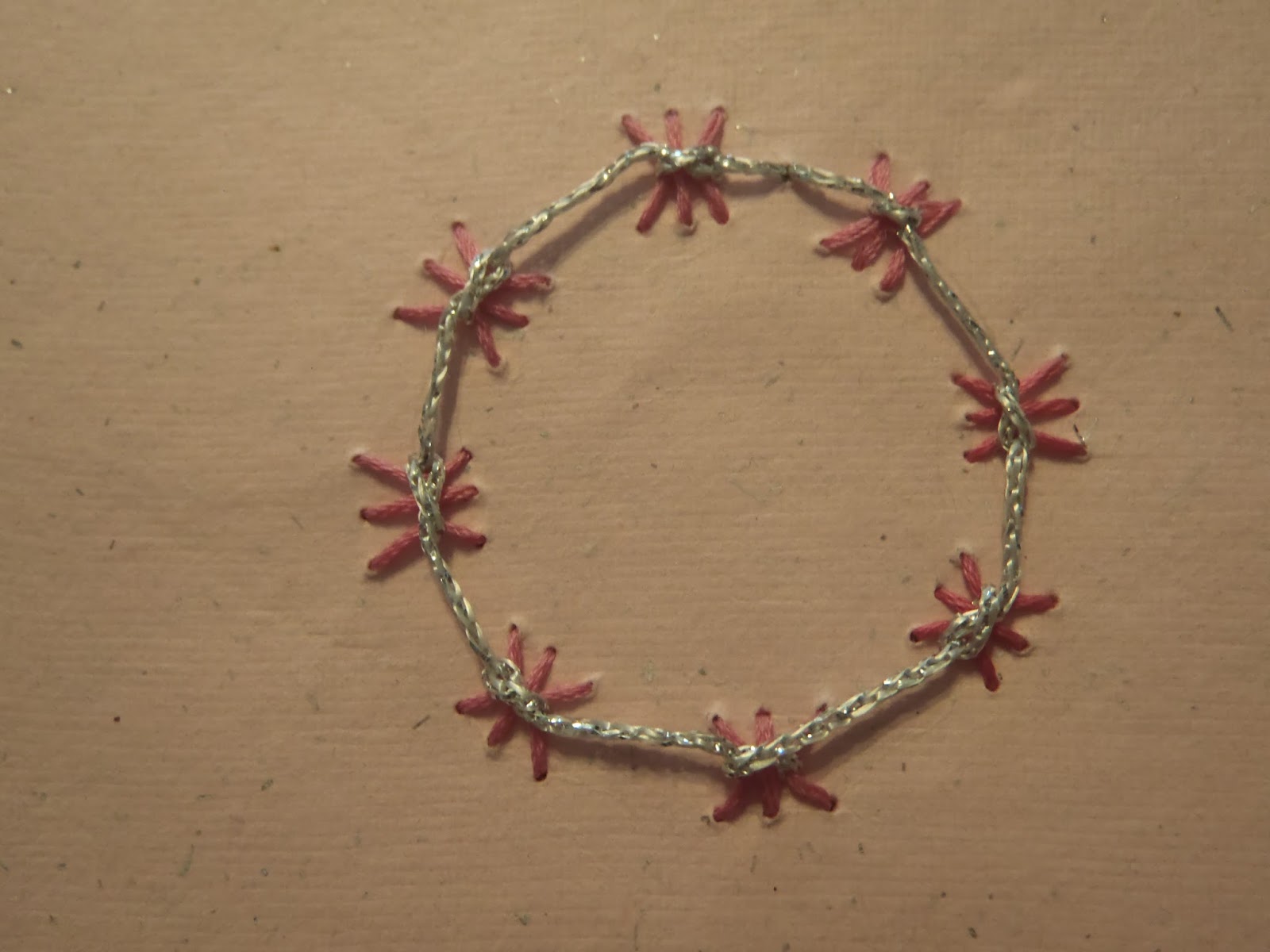 I have been too busy to be able to participate in Take a Stitch Tuesday with Sharon B at pintangle.com for a while. It felt good to do the the Butterfly Chain Stitch today. I think it worked rather well stitching onto the handmade paper. The paper is in fact pink with silver fleck but the camera didn't capture that properly.